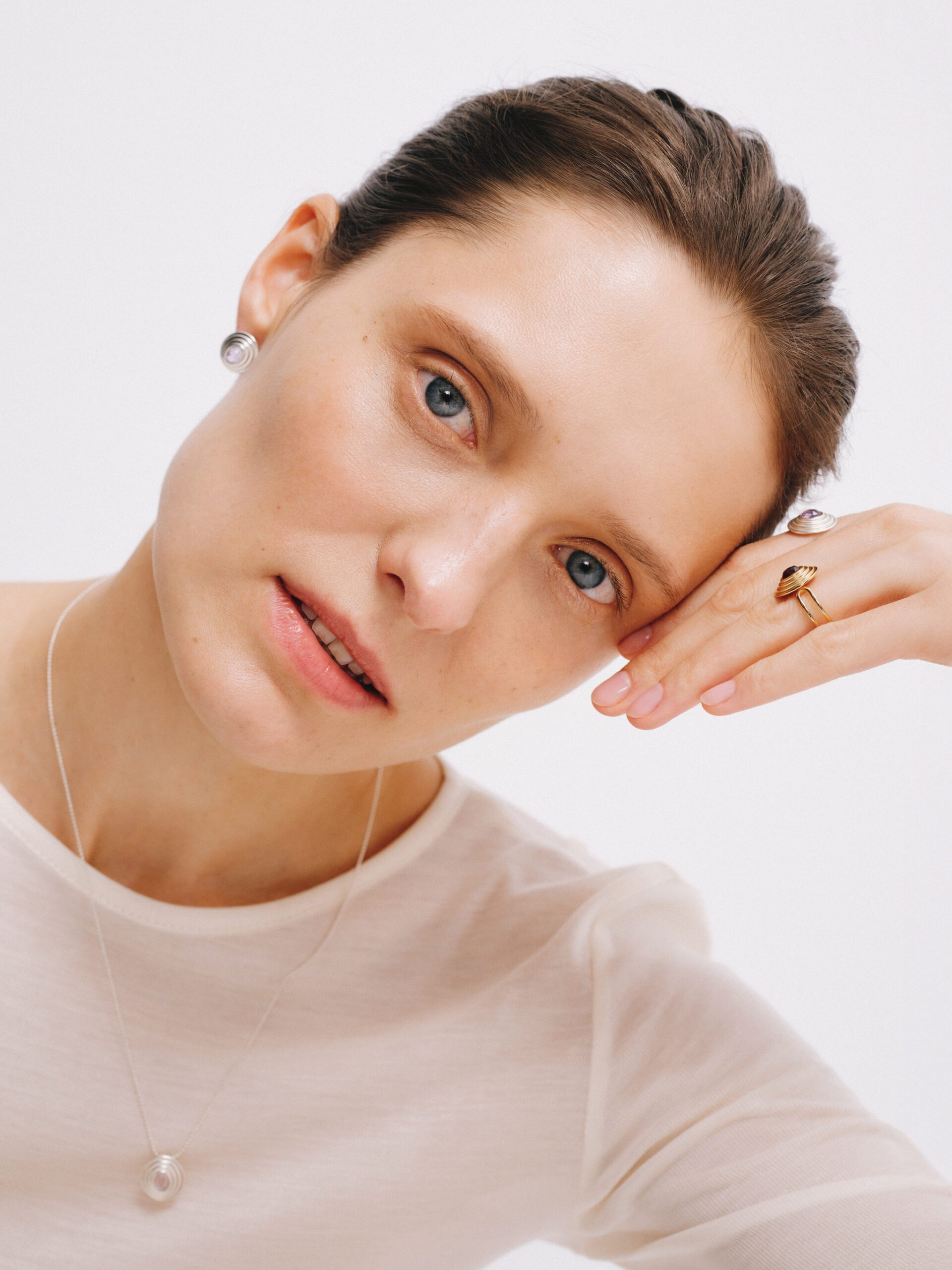 EMBER stud earrings crafted from 925 sterling silver, featuring a sculptural, concentric form with a centrally set, faceted natural gemstone. The delicately ribbed surface, inspired by vintage style, beautifully reflects light, while the lightweight design ensures comfortable wear.