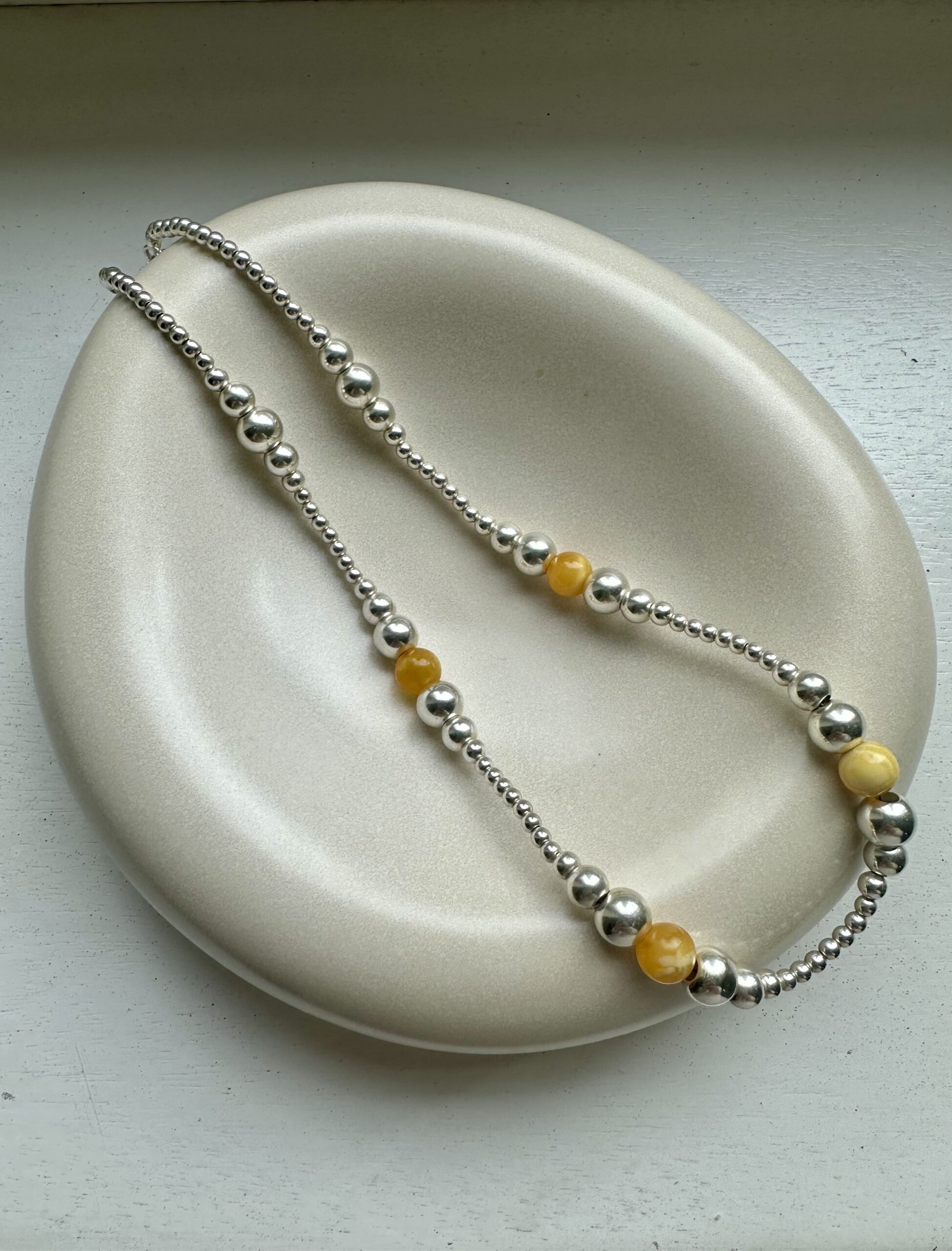 Naszyjnik złożony z różnej wielkości kuleczek wykonanych ze srebra 925 oraz kul z bursztynu bałtyckiego w kolorze miodowym. Bursztyn jest ręcznie szlifowany w naszej pracowni przez co każdy kamień jest unikatowy i może różnić się od tego na zdjęciu.