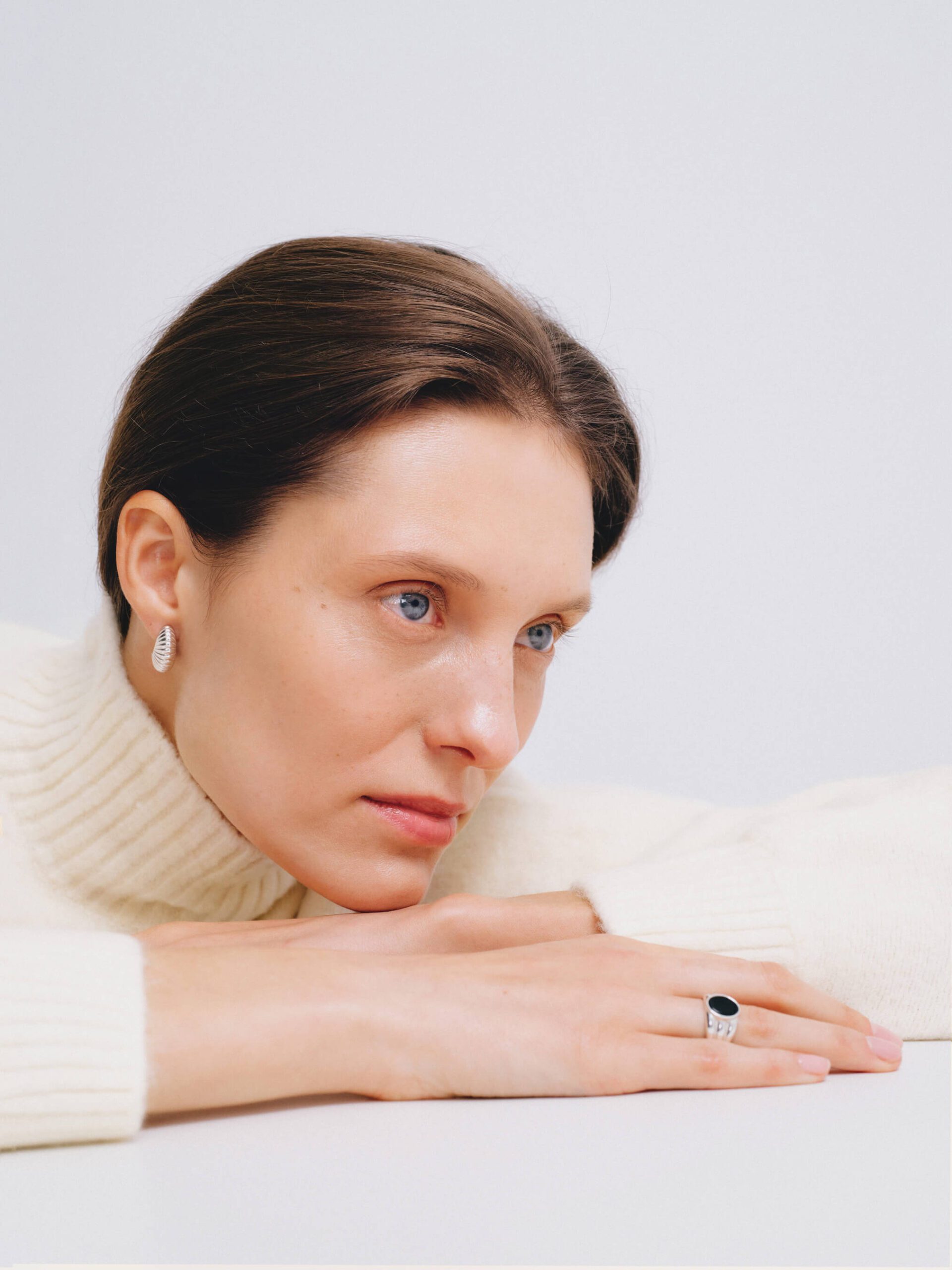 Sygnet SOLIS wykonany ze srebra próby 925 z centralnie osadzonym onyksem. Miękka, organiczna forma i polerowana powierzchnia podkreślają ciepło kamienia oraz ponadczasowy charakter projektu nawiązującego do stylu vintage.